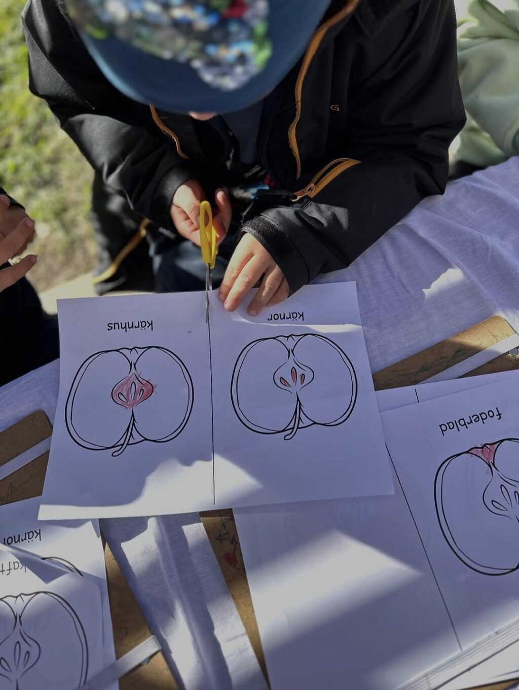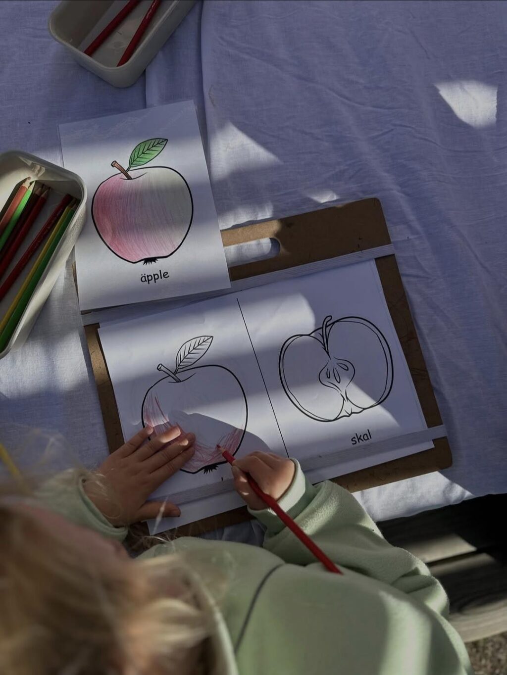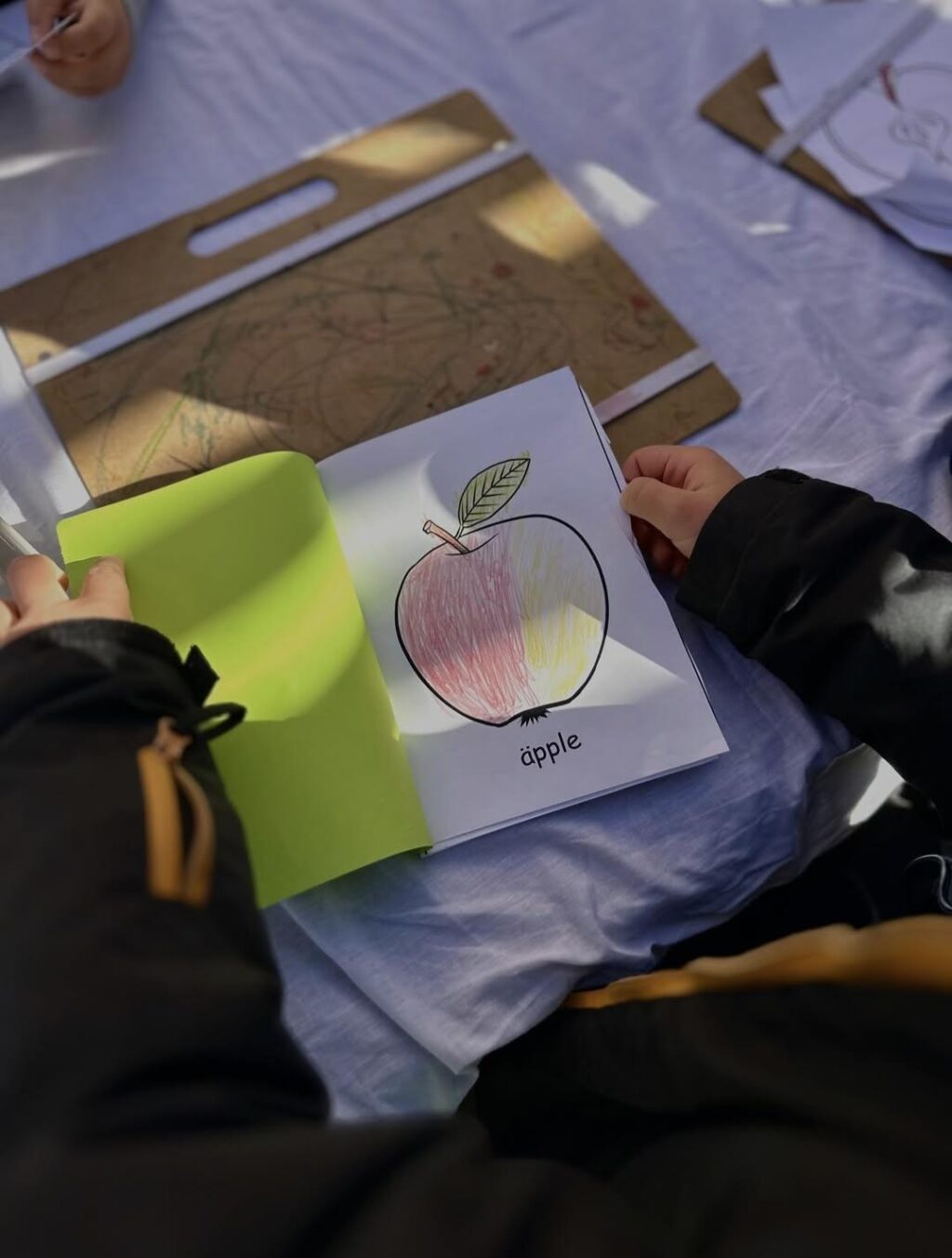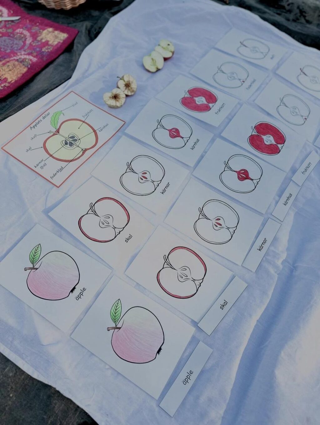 Barnen på förskolan Svartgarn fick skapa varsin bok där de fick underlag att färglägga enligt bildkorten, när alla sju delar av äpplet färglagts tränade barnen på klippteknik och sedan på att häfta ihop boken och skriva sitt namn. En egen bok om äpplets alla delar fick sedan följa med hem!