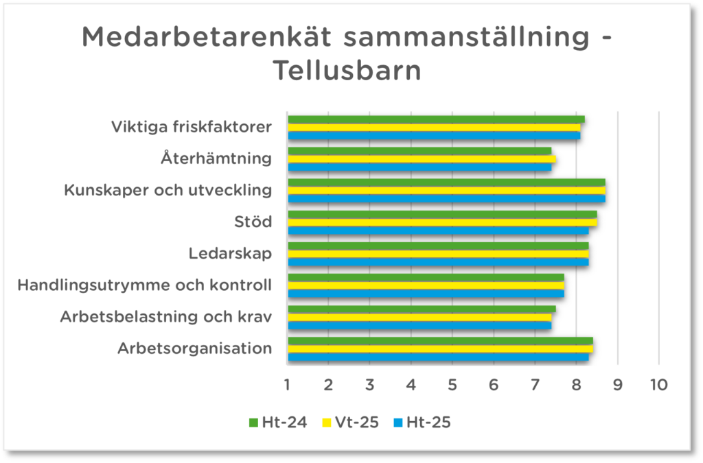 Medarbetarundersökningen hösten 2025 för Tellusbarn, genomförd i oktober, visar även här mycket goda resultat. Särskilt starka områden är kunskaper och utveckling, arbetsorganisation samt ledarskap. Med en svarsfrekvens på 90 procent och ett sammanlagt resultat på 8 av 10 framgår att medarbetarna i hög grad upplever att deras kompetens tas tillvara och att det finns goda möjligheter till lärande och utveckling i arbetet. Arbetet beskrivs som välorganiserat med tydliga mål, roller och rutiner, vilket bidrar till trygghet och motivation i vardagen. Sammantaget speglar resultaten en arbetsplats med starka förutsättningar för engagemang, trivsel och långsiktig hållbarhet.
