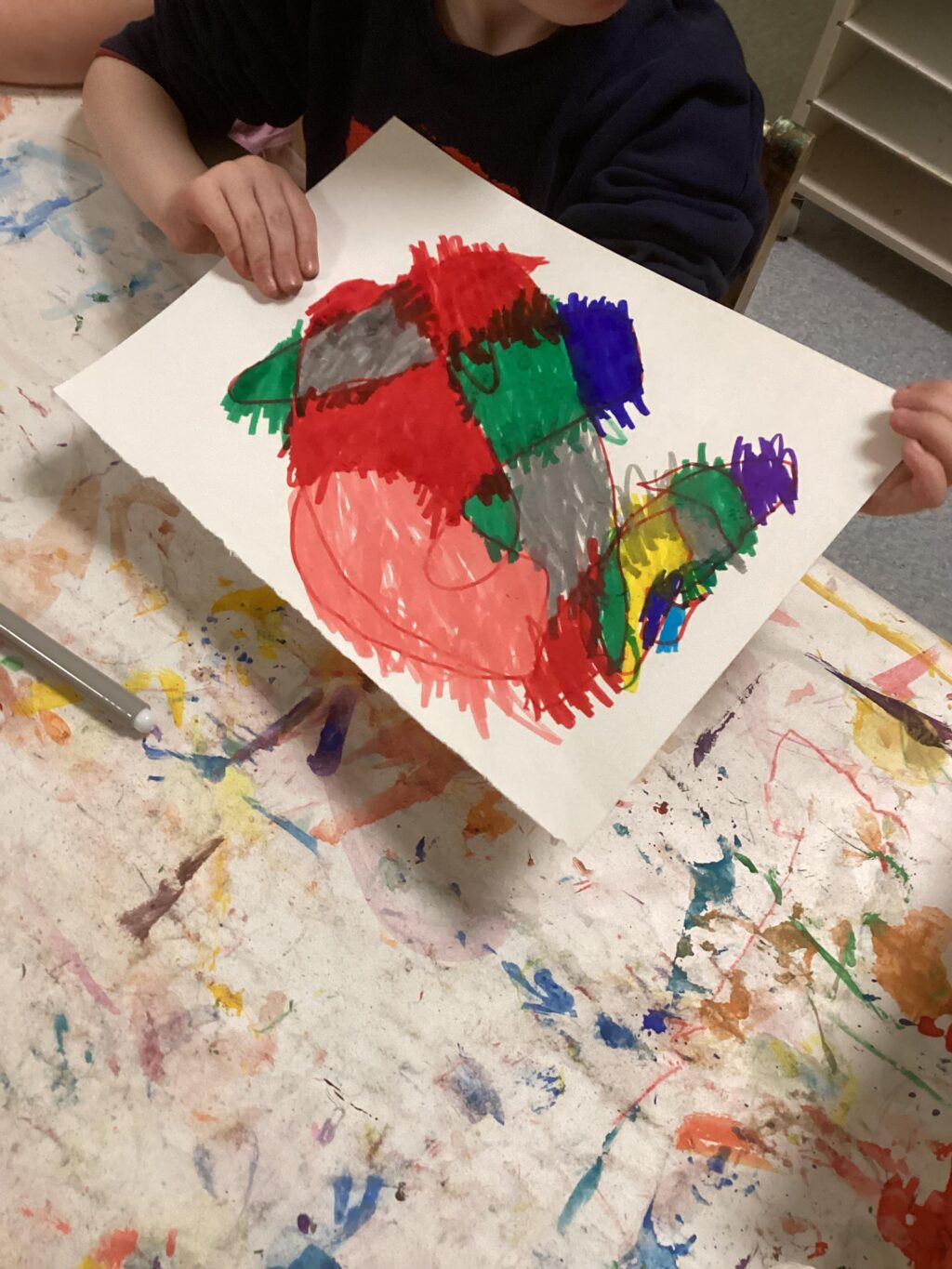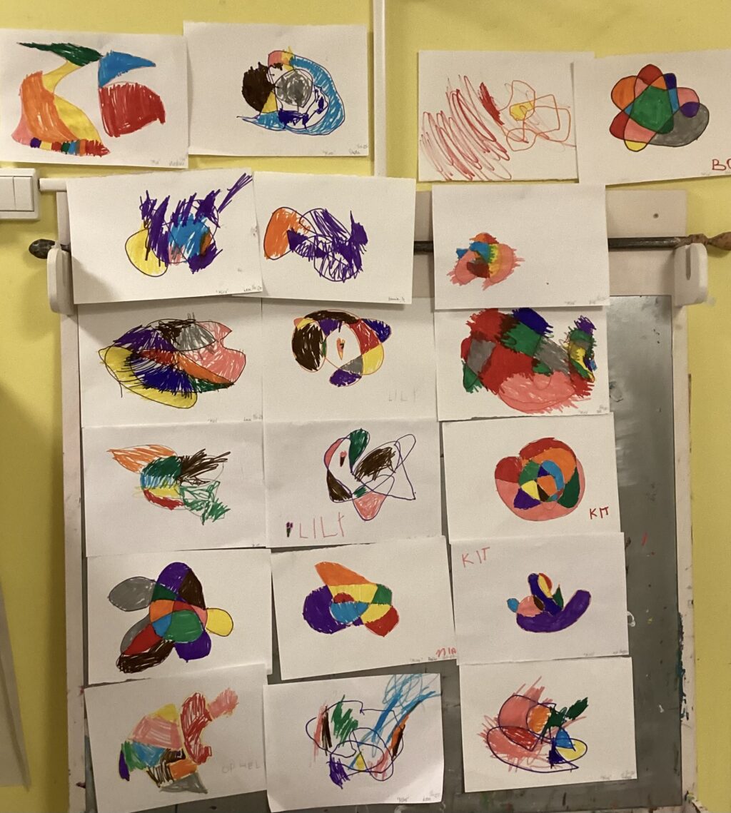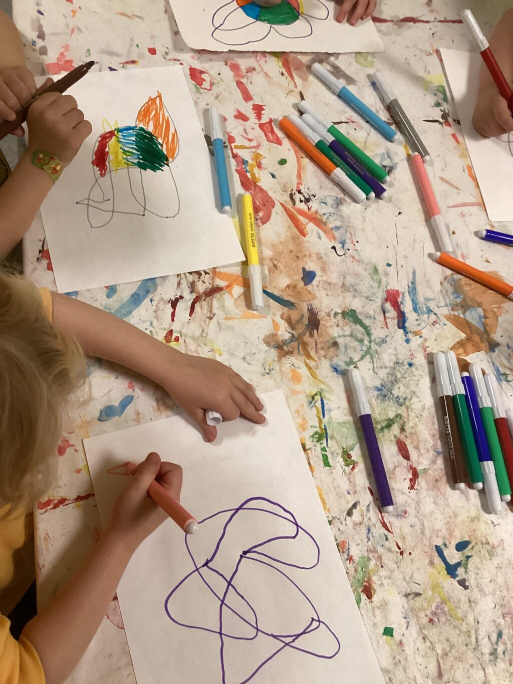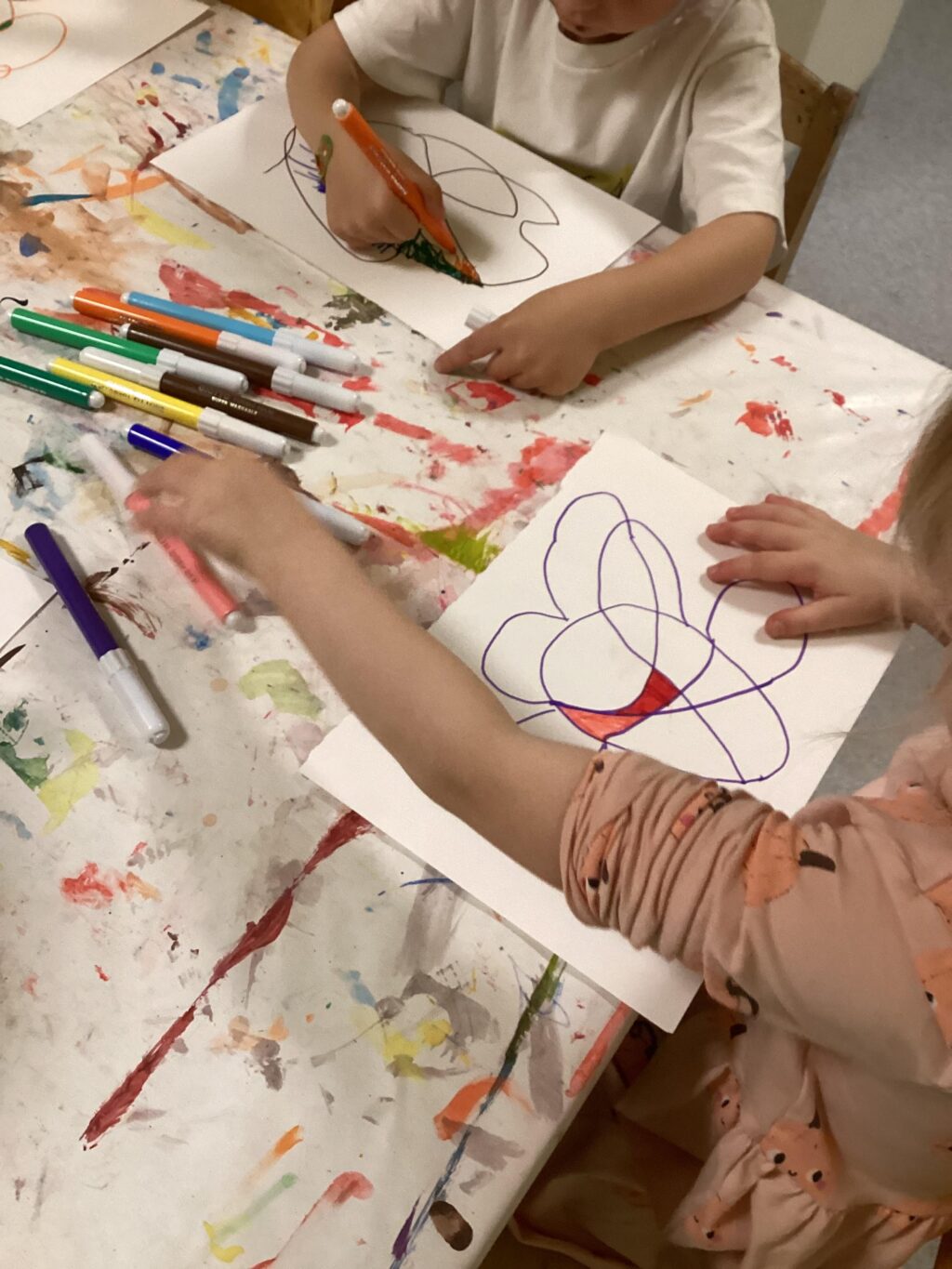 Efter att ha tittat på Mirós konst skapade barnen sina egna tolkningar. De valde kulörer och ritade figurer med tuschpennor, ett material som sällan används i ateljén, men som den här gången passade perfekt för detaljer och fokus.