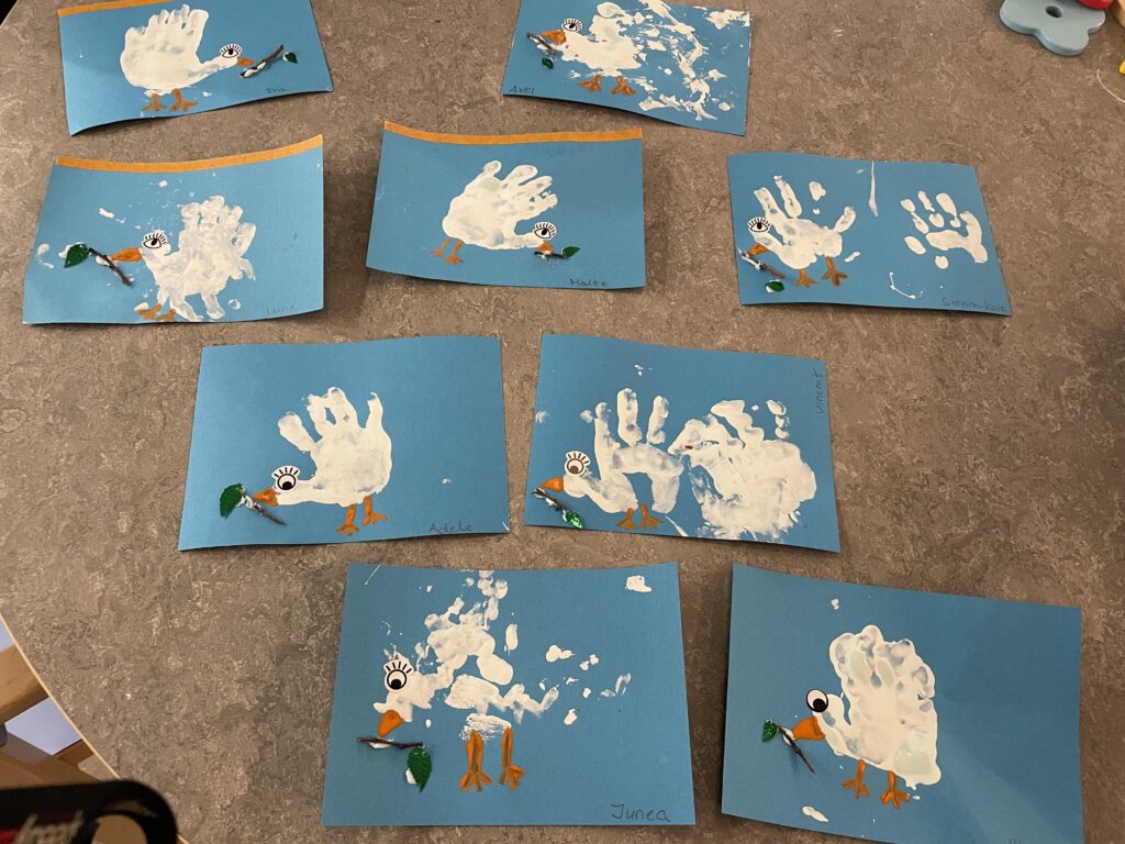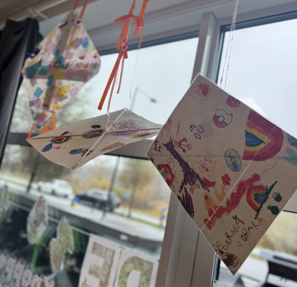 Med inspiration från böcker som Så växer världen har barnen skapat fredsträd och målningar med flaggor från olika länder, symboler för gemenskap, mångfald och samarbete mellan människor. På flera förskolor har det även tillverkats fredsduvor i olika former och material. Genom skapandet har barnen fått prata om att alla är olika men lika viktiga, och att fred börjar med omtanke och vänlighet i det lilla. Några av de äldre barnen arbetade med att bygga egna drakar, som symboliserar deras framtidsdrömmar om en bättre värld. Tillsammans lät dom drömmarna flyga för tillsammans kan vi göra skillnad.