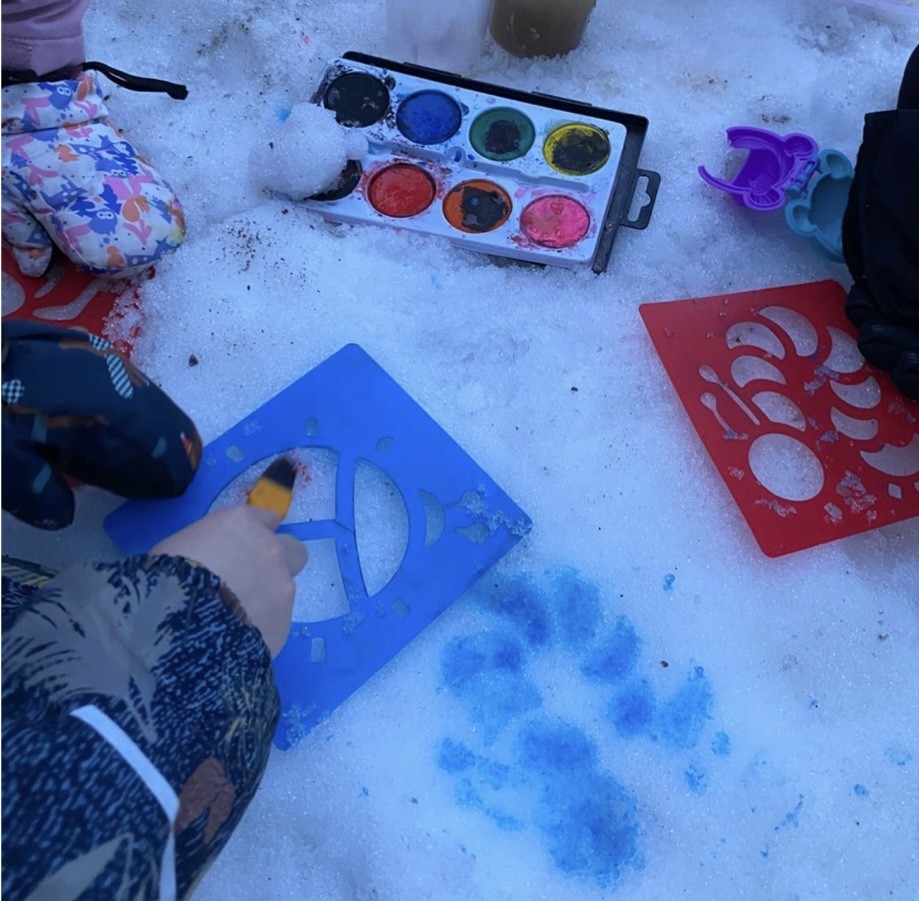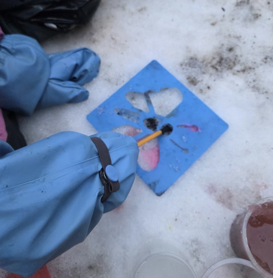 Barnen har bland annat fått utforska snö som material genom skapande aktiviteter utomhus. Med hjälp av färg och schabloner har de skapat mönster och former i snön, blandat färger och upptäckt hur färgen förändras när den möter kyla. Aktiviteten väckte stor nyfikenhet och skaparglädje och gav barnen möjlighet att använda sin fantasi, träna finmotorik och samarbeta med varandra, samtidigt som de närmade sig enkla naturvetenskapliga fenomen på ett lekfullt sätt.