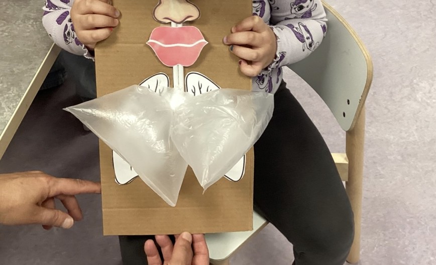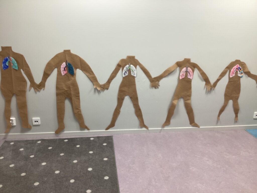 Genom lek, samtal och experiment har barnen fått utforska kroppens olika funktioner. När lungorna stod på tur användes sugrör och plastpåsar för att konkret se hur luft rör sig in och ut ur kroppen, ett roligt och uppskattat sätt att lära med hela kroppen.