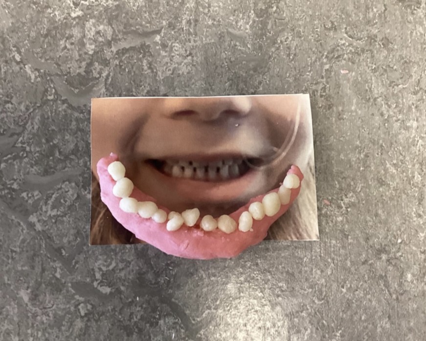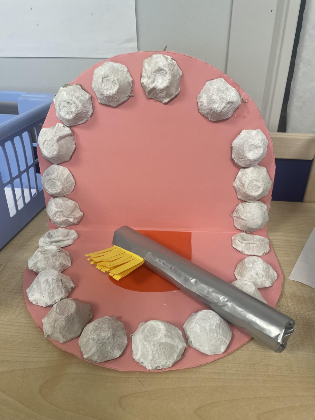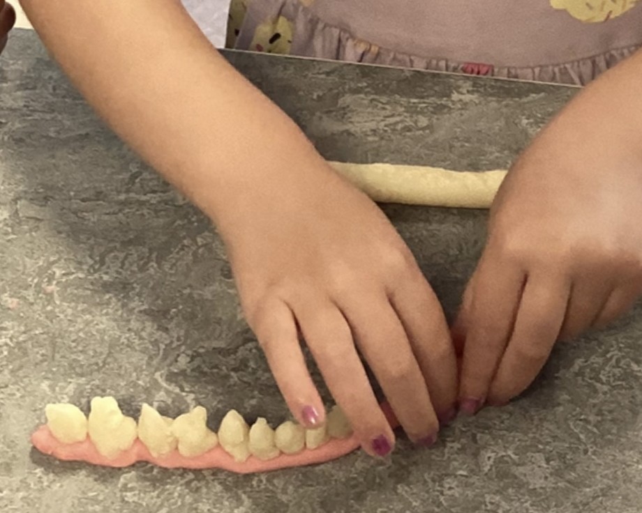 Utifrån detta skapades både egna tandrader i playdoh och en gemensam stor mun av äggkartonger och wellpapp. Ett kreativt och konkret sätt att undersöka hur tänderna sitter och vad de används till.