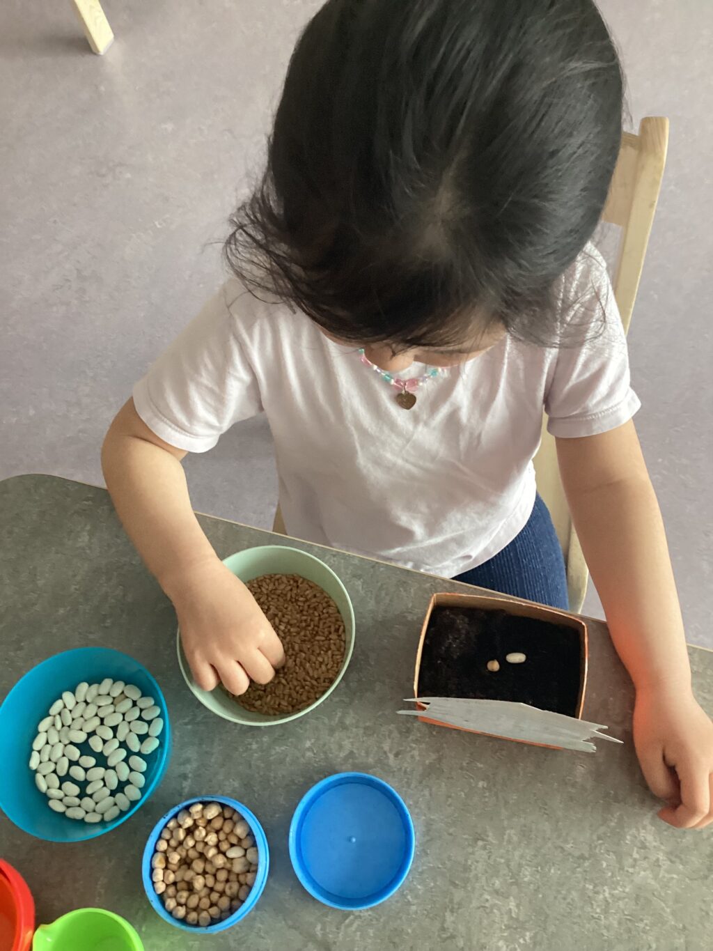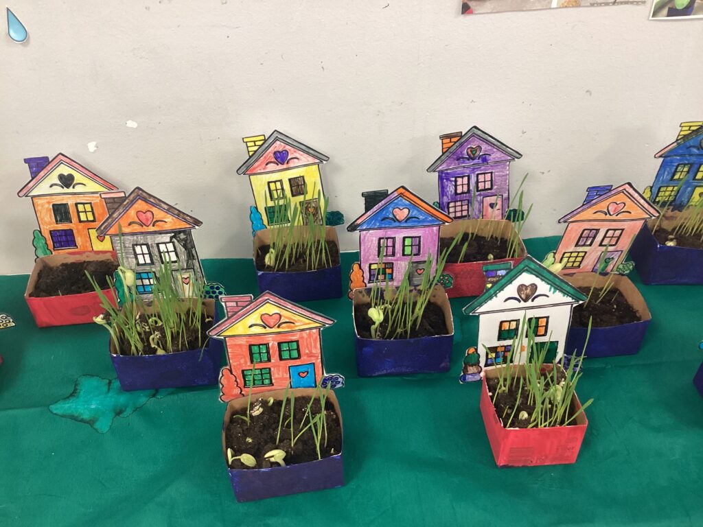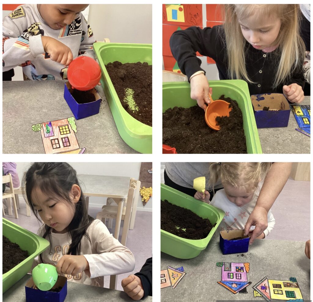 Nästa steg i projektet var själva odlingen. Kikärtor och vita bönor planterades i de målade kartongerna, och barnen fick lära sig vad frön behöver för att växa, jord, vatten och ljus. De tog ansvar för sina odlingshus, vattnade omsorgsfullt och följde växternas utveckling med stort intresse.