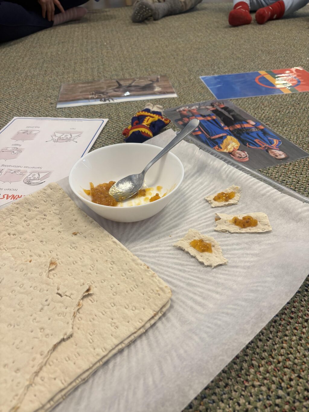 Barnen har tittat på bilder av samernas färglada kläder som kallas kolt och samtalat om färger som blå och gul. De har fått känna på renhorn och titta på bilder av renar, vilket väckte många frågor och funderingar. Joik har lyssnats på samtidigt som barnen fick smaka hjortronsylt på tunnbröd, något som uppskattades mycket och skapade både glädje och nyfikenhet.