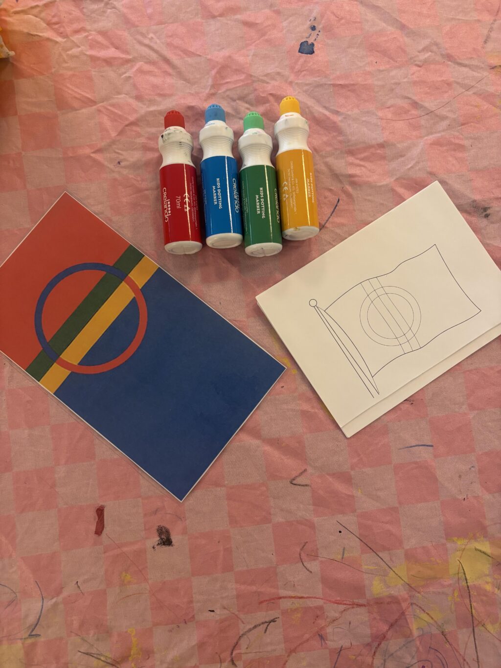 Samtal har även förts om den samiska flaggan och vad dess färger symboliserar. Som avslutning har barnen målat egna flaggor som sedan sattes upp på väggen. Aktiviteten skapade engagemang och gav barnen möjlighet att uttrycka sina upplevelser genom bild och färg.
