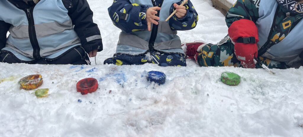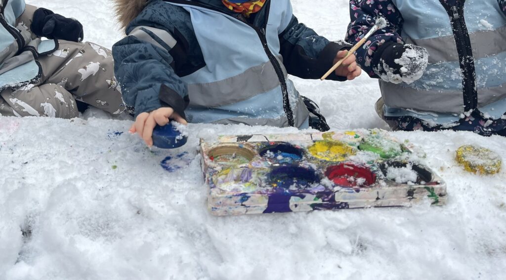 Under en utflykt till parken fick barnen måla och experimentera med färg i snön. Med stort intresse följde de hur färgerna spred sig över snöns yta. Tillsammans samtalade pedagogerna och barnen om att snö är en fast form och hur den, när den smälter, övergår till vatten som är en vätska. När snön långsamt förändrades kunde barnen se hur färgerna flöt samman och skapade mönster. På ett enkelt och lustfyllt sätt fick barnen närma sig förståelsen för hur material kan förändras.