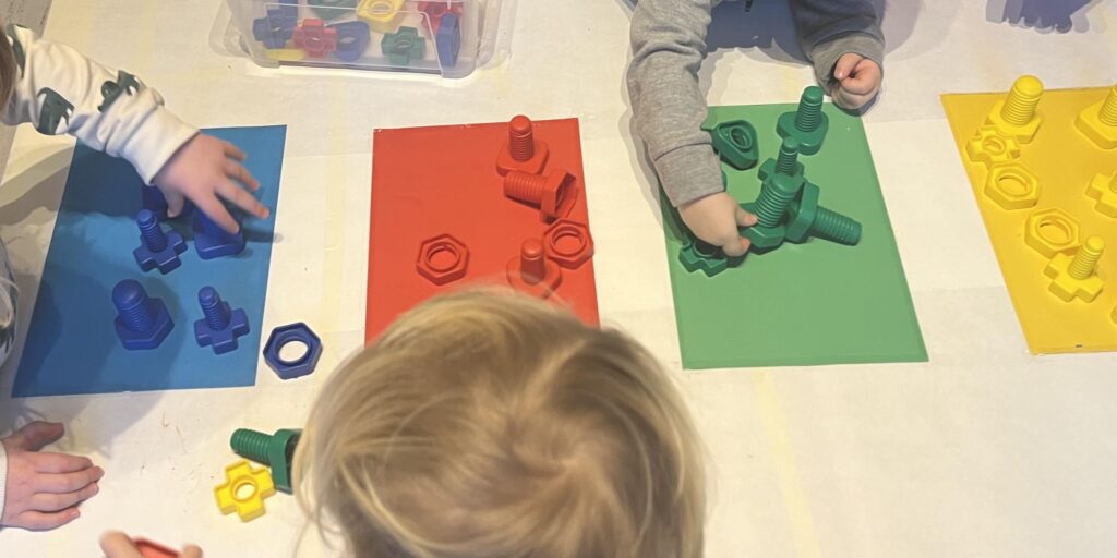 Inomhus fortsatte lärandet genom sorteringsaktiviteter med olika material. Barnen grupperade föremål utifrån färg och tränade sin färgigenkänning och förmåga att sortera. Aktiviteterna bidrog även till att utveckla barnens observationsförmåga, tänkande och finmotorik.