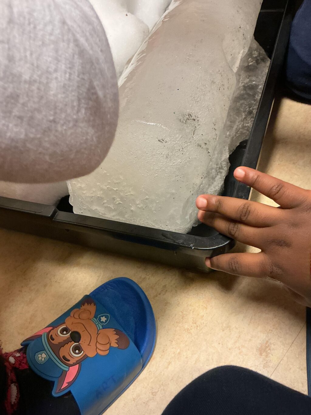Inomhus fick barnen undersöka snö och is med alla sinnen. Hur känns det? Vad är skillnaden mellan snö och is? Barnen upptäckte bland annat små luftbubblor i isen och delade tankar kring kyla, vatten och hur snö kan användas på olika sätt.