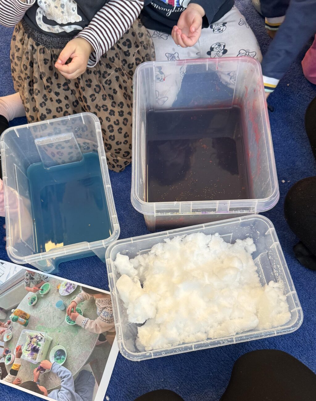 Inomhus har barnen fortsatt utforskandet genom att undersöka hur snö förändras när den utsätts för kyla och värme. Genom samtal och gemensamma observationer har barnen utforskat hur snö smälter och blir till vatten.